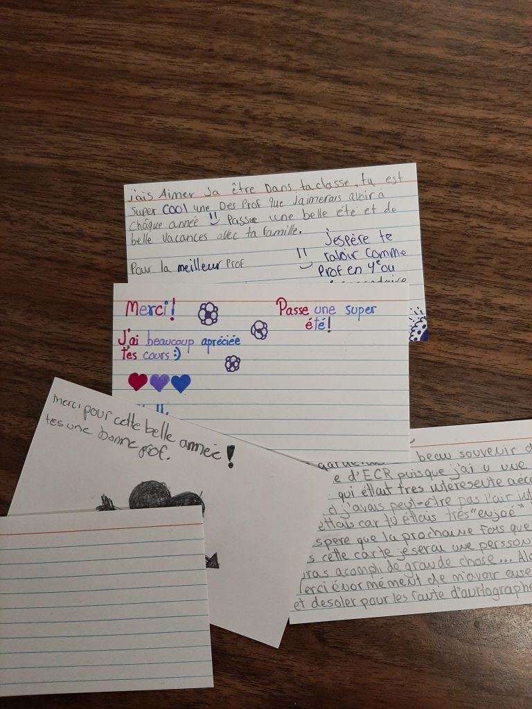 J’ai parfois des surprises: des élèves très discrets ou qui ont l’air très détachés qui prennent le temps d’écrire un message super gentil ou démonstratif. Alors que nous avons des groupes qui sont très nombreux et qu’il est parfois difficile d’avoir de l’interaction avec nos élèves qui fonctionnent bien, c’est une belle occasion d’avoir une communication personnalisée avec eux.