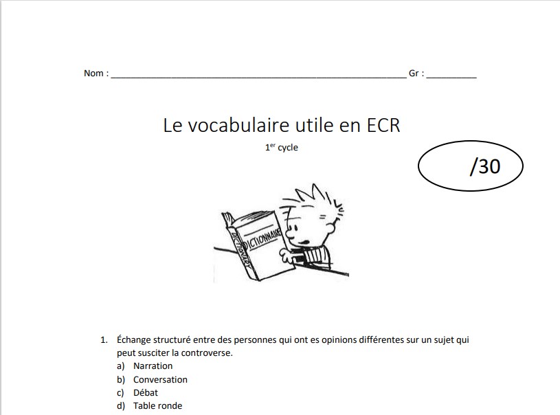 Quand j’ai enseigné ECR en 5ème secondaire, c’était un ajout à ma tâche et je l’ai su à la dernière minute (grâce à des élèves qui publiaient des photos de leur horaire sur Facebook, mais ça c’est une autre histoire qui n’a pas vraiment sa place ici. Bref.). Les parents des élèves avaient déjà acheté un ensemble de fascicules, Voir Autrement, aux éditions CEC.