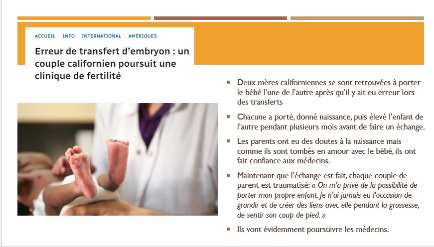 Les embryons de deux couples ont été échangés quelque part dans le processus, et chaque mère s’est retrouvée à porter l’enfant de l’autre. Les deux couples ont été informés de l’erreur seulement plusieurs mois après la naissance des bébés.