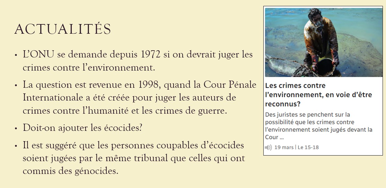 Si on parle de génocide et d’écocide, c’est l’occasion de parler de tous les mots en -cide et de leur signification, avec des exemples comme homicide, fratricide, herbicide… et aussi féminicide.