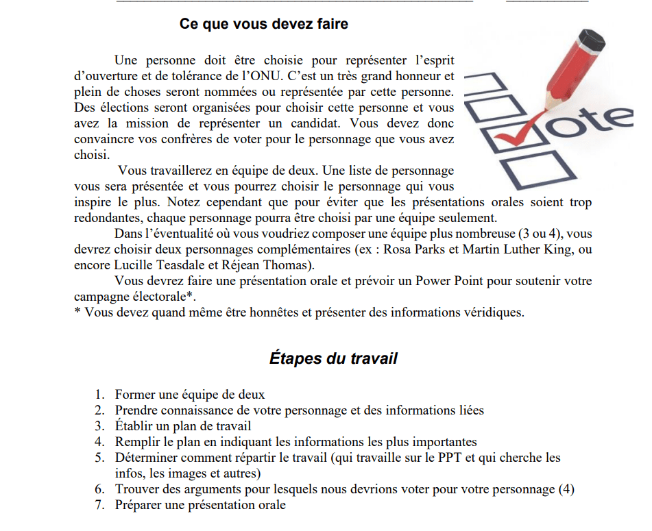 J’utilisais ce projet pour amener les élèves à présenter des personnages historiques qui sont considérés comme des modèles de tolérance et d’ouverture d’esprit. On pourrait aussi dire que ce sont des exemple, en général, de personnes qui ont contribué à améliorer le monde dans lequel on vit.